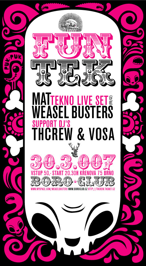 Mat Weasel Busters je v Brně oblíben nejen publikem, ale i dýdžeji. Vydal přes 40 desek na řadě labelů, např. Humungus, WAR, Tekita atd. Hraje veselé punkové free tekno se spoustou nečekaných a vtipných samplů. V Boro klubu, kde je maximálni kapacita 250 lidí, budete moci nahlédnout pod pokličku jeho skladatelského umění opravdu hodně zblízka. Obrázek o tom, co nás 30.března v Boru čeká, si můžete udělat zde..