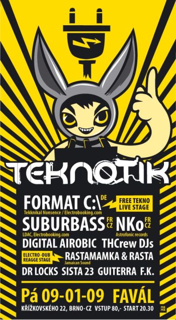 Prijd zaparit na 4.rocnik Teknotiku. Ceka te nejen spousta dobrych free tekno live setu, ale i pet holek za gramcama na druhe elektro, reagge, dub stagei. Prejeme klidny svatky a hodne muziky v roce 2009. Odstartuj to na TEKNOTIKU! THCrew Brno