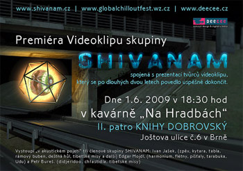 Dne 1.6. 2009 v 18:30 hodin v kavárně „Na Hradbách“ II. patro KNIHY DOBROVSKÝ Joštova ulice č.6 v Brně proběhne premiéra videoklipu skupiny SHIVANAM spojená s prezentací tvůrců videoklipu, který se po dlouhých třech letech povedl úspěšně dokončit.