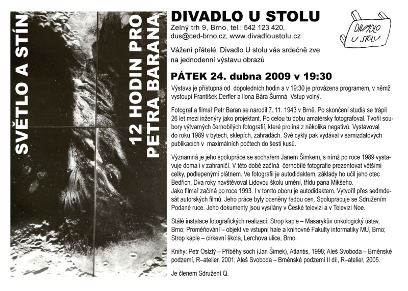 v pátek 24. dubna. V Divadle U stolu výstava černobílých fotografií spojená s promítáním filmu. Výstava je přístupná od dopoledních hodin (vstup volný) a v 19:30 je provázena programem, v němž vystoupí František Derfler a Ilona Bára Šumná.