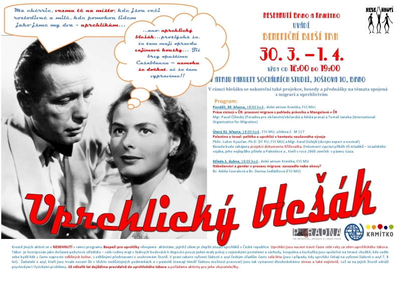 Nakoupit užitečné věci za rozumné ceny, přispět tím na aktivity pořádané pro uprchlíky, zúčastnit se zajímavých besed a projekce na téma migrace a gender, palestinsko-izraelský konflikt nebo práce cizinců v ČR. To vše budou moci návštěvníci benefičního blešího trhu, který ve dnech 30. března až 1. dubna 2009 pořádá NESEHNUTÍ ve spolupráci s Krmítkem. Uprchlický blešák, který je otevřen nejen studentům Masarykovy univerzity, ale i široké veřejnosti, bude probíhat vždy od 12 do 19 hodin v atriu Krmítka Fakulty sociálních studií Masarykovy univerzity.