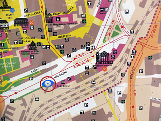 Avšak věc má jeden háček. Po vzoru zašifrovaných, tajných a matoucích sdělení, či bojových skautských her, je ono oko ve skutečnosti špatným rádcem. Kupříkladu : Stojíte-li na rohu ulic Za divadlem a Jezuitské, poblíž Zemanovy kavárny, jste náležitě poučeni, že se nacházíte v okolí pátého nástupiště u hlavního nádraží. Na zastávce tramvaje č.4 na ulici Údolní vám je pro změnu předložen fakt, že stojíte sice na trhu, avšak nikoliv Obilním, nýbrž Zelném. U autobusového nádraží naproti hotelu Grand, pošty v sousedství pátého nástupiště na hlavním nádraží, na Veselé (mezi Dominikánským náměstím a Besedním domem), na Joštově a naproti Ústavnímu soudu není na mapě zlověstné oko zobrazeno pro jistotu vůbec, byť je poctivě uvedeno ve vysvětlivkách… Jak si vysvětlit tuto záhadu? Nabízí se vysvětlení : autoři projektu pravděpodobně počítali s tím, že Brno je tak malé, že se nemáme kde ztratit. Kdyby přesto přetrvávaly potíže s orientací, lze ještě doporučit metodu velkého Old Shatterhanda – nasliněný ukazováček zdvihnout nad hlavu a zjistit, odkud fouká severák.