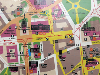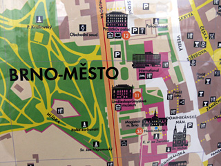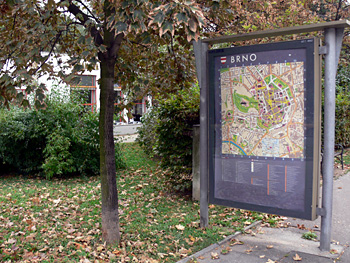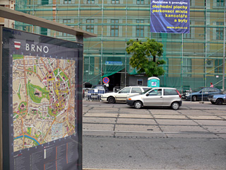 Řeč je o informačních tabulích, na kterých se nachází MAPA MĚSTA BRNA. Na první pohled dokonalost sama. Hnědožlutý kontrast, čitelná jména ulic, noční osvětlení, některé významné budovy zobrazeny v miniaturách a samozřejmě nechybí ani to nejdůležitější : veliké modro-červeno-bílé oko, zobrazeno v místech, kde se nacházíte a pod mapou vysvětlivka ve třech světových jazycích (ZDE STOJÍTE / YOU ARE HERE / SIE SIND HIER). Co víc si přát.