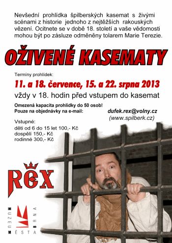 Agentura REX ve spolupráci s Muzeem města Brna nabízí nevšední prohlídku špilberských kasemat s živými scénami z historie jednoho z nejtěžších rakouských vězení. Ocitnete se době 18. století a vaše vědomosti mohou být po zásluze odměněny tolarem Marie Terezie.