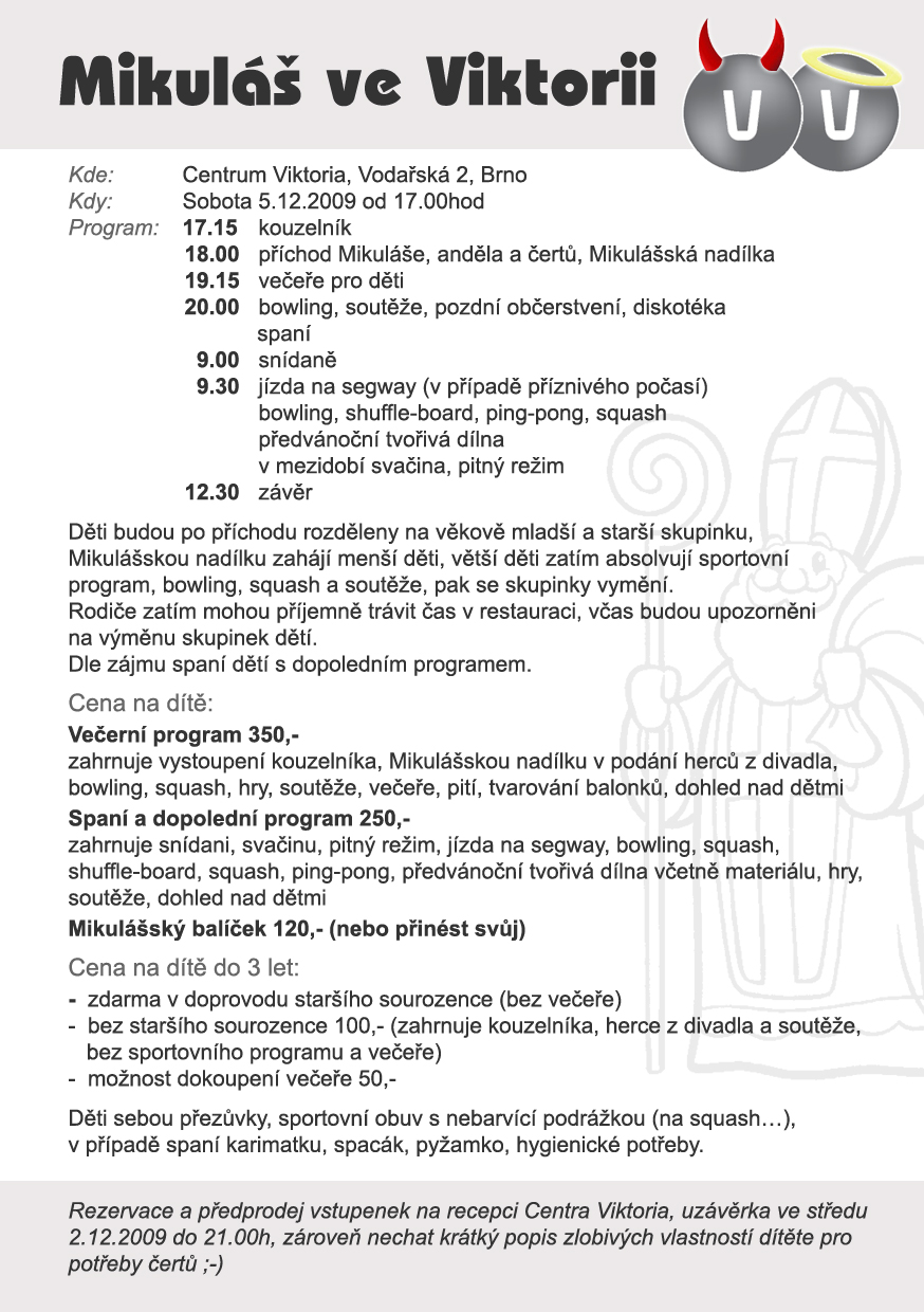 Rádi bychom vás i vaše děti pozvali do Viktorie, a to dne 5. prosince od 17:00. Nejen Mikuláš si pro vás připravil bohatý program.