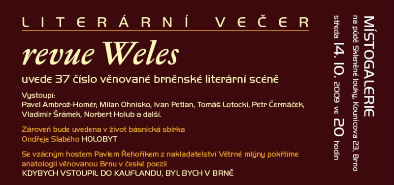 Ve středu 14. října ve 20:00 se na půdě Skleněné louky koná “Literární večer revue Weles”. Uvede 37 číslo věnované brněnské literární scéně. Vystoupí Pavel Ambrož-Homér, Milan Ohnisko, Ivan Petlan, Tomáš Lotocki, Petr Čermáček, Vladimír Šrámek, Norbert Holub. Srdečně zve