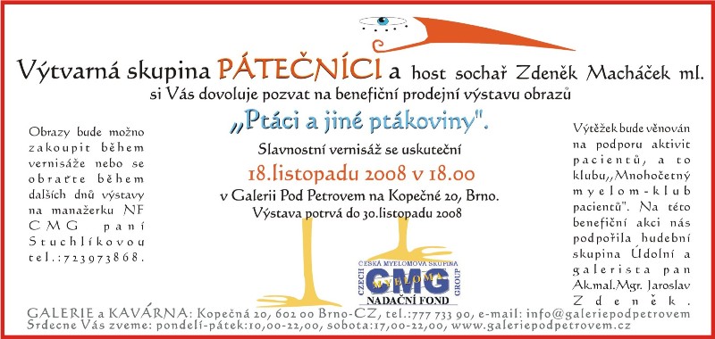 5. benefiční výstavu, kdy členky a čelnové výtvarné skupiny Pátečníci věnují výtěžek prodeje svých děl Nadačnímu fondu CM, tentokrát k přímé podpoře Klubu pacientů. s mnohočetným myelomem.