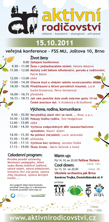 Třetí ročník konference Aktivní rodičovství zahájí již v pátek 14. 10. koncert skupiny Yellow Sisters, který proběhne v sále Kavárny Trojka na Dominikánské 9. Celou sobotu 15. 10. konferenci opět hostí Fakulta sociálních studií na Joštové 10, jejíž velkorysé prostory umožní paralelní program ve dvou sálech a zázemí pro rodiny s dětmi. Dětském koutku bude po celý den probíhat doprovodný program.