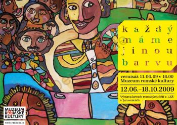 Pozvánka na zahájení výstavy „Každý máme jinou barvu“, která se uskuteční v Muzeu romské kultury, Bratislavská 67, Brno dne 11. 6. 2009 v 16:00 hodin.