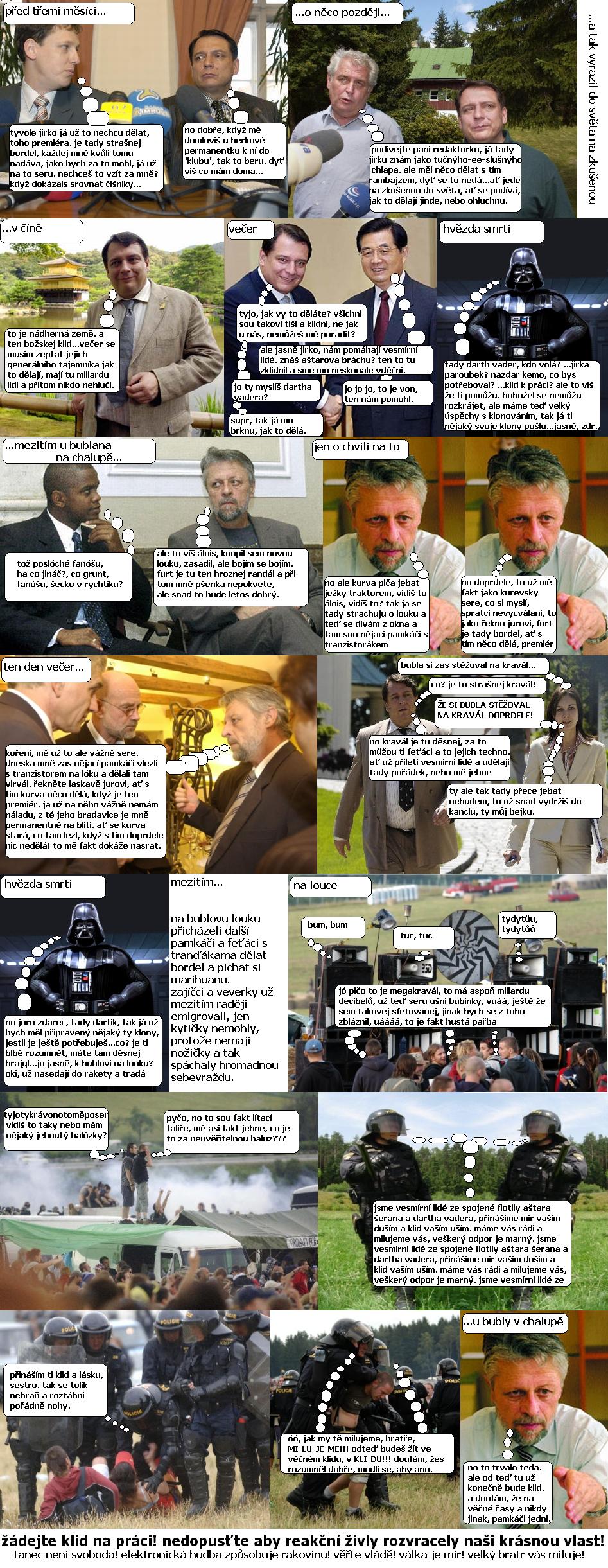 Dnes od 18 hodin se v Brně uskutečnila klidná manifestace převážně mladých nespokojených lidí. Řečníci ve svých projevech kritizovali současné poměry v zemi, zejména přebujelé a nezvladatelné represívní složky státního aparátu a donebevolající pokrytectví vlády současné ve všech předchozích podobách. Žádali pro začátek rezignaci několika ministrů. Apelovali na zúčastněné, aby svoji nespokojenost vyjadřovali každodenně, mírovými prostředky a aby současnou frustraci vyjádřili v blížících se volbách. Vystřídala se asi desítka řečníků a dav se následně vydal pokojným pochodem do oblasti Hlavního nádraží (ve stávající poloze), kde se po chvíli rozešel.