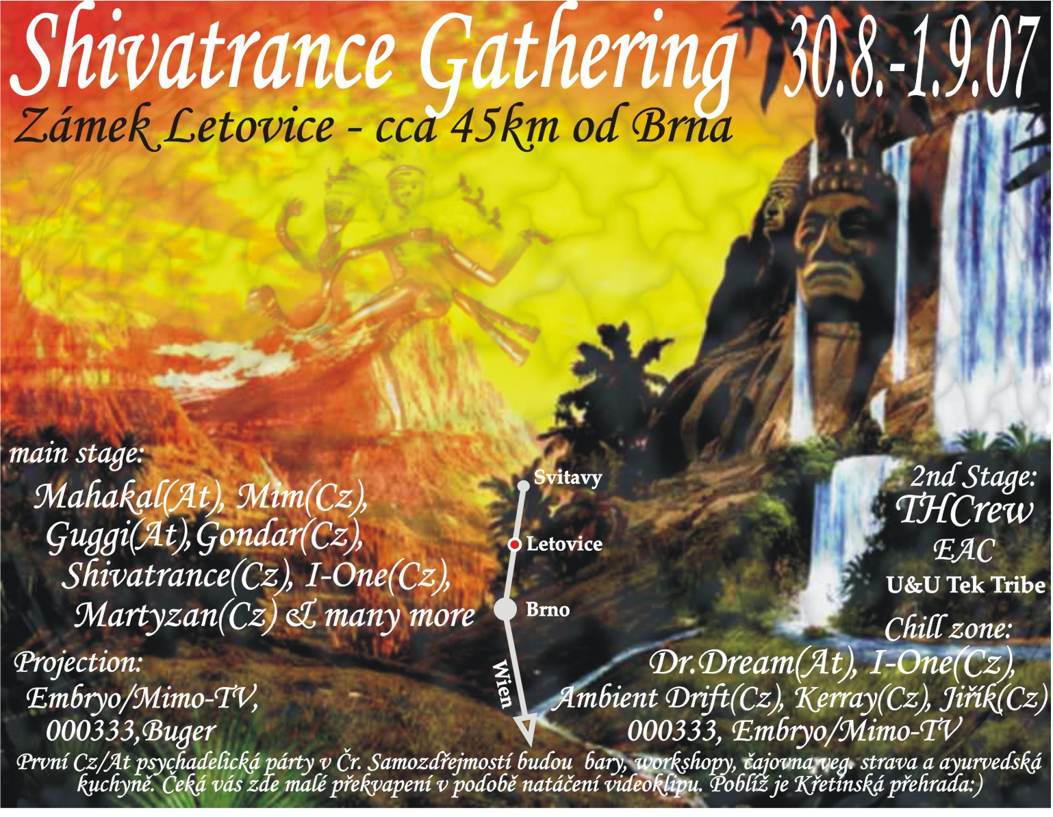 V poslední prázdninový víkend bude patřit Letovický zámek taneční muzice ve stylech TRANCE a TEKNO. Akci s největší péčí pořádá skupina okolo hudebníka Ivana Jaška, očekávejte zde kromě tří non stop floorů také živá vystoupení kapely Shivatrance, bude se zde dokonce natáčet jejich nový videoklip. Pořadatelé dále lákají na kvalitní party servis – bary, čajovna, etnická kuchyně, nedaleko jsou rovněž různé možnosti koupání. Není bez zajímavosti, že na akci se chystají stovky mladých rakušanů, nemaj to totiž také lehké, začal tam u nich platit zákonný zákaz tohoto druhu zábavy. U nás to naštěstí prozatím ještě jde, proto neváhejte a přijeďte se přesvědčit, že “tekno je všechno a trance ještě více”. Nashledanou v Letovicích.