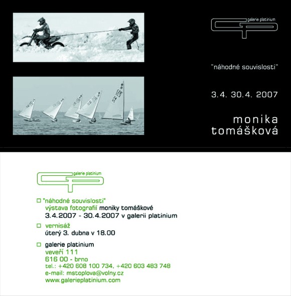 Rádi bychom vás pozvali na vernisáž k výstavě fotografií Moniky Tomáškové, která proběhne 3. dubna v 18 hodin v Galerii Platinium. Výstava potrvá do 30.dubna 2007.